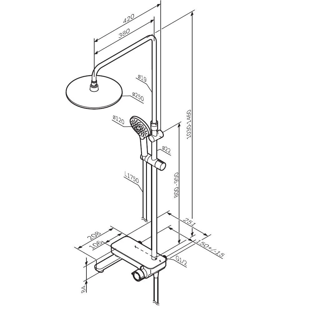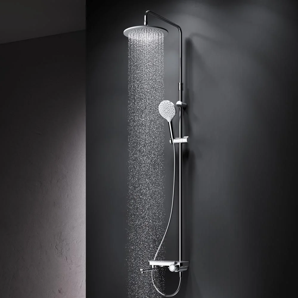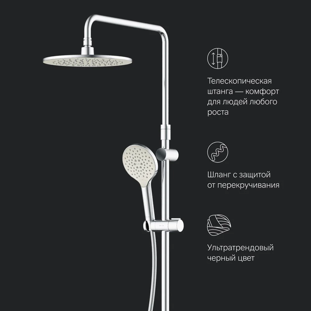Премиальные размеры и продуманные детали: увеличенный диаметр душевых леек (верхний душ 254 мм и ручной душ 120 мм) позволит ощутить преимущества тропического душа тогда как увеличенная длина шланга 1750 мм обеспечит свободу движений во время принятия душа. Телескопическая поворотная штанга регулируется по высоте в диапазоне от 1030 до 1460 мм обеспечивая комфорт для людей любого роста а шаровой шарнир в держателе верхнего душа позволяет регулировать угол его наклона.
