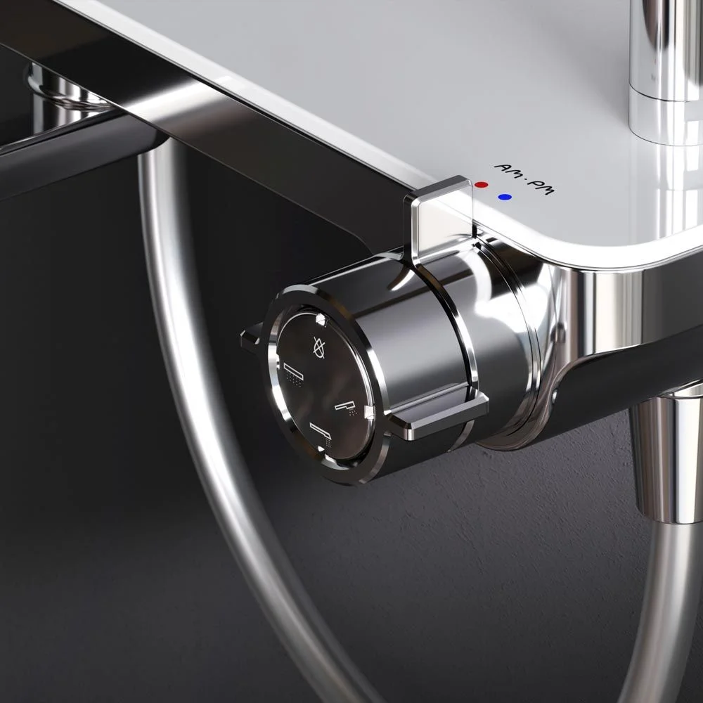 Смеситель выполнен в виде полочки. Чистый дизайн без лишних деталей: переключатель расположен за ручкой настройки температуры и позволяет менять источник потока воды от ручной лейки и излива до верхнего душа. ""