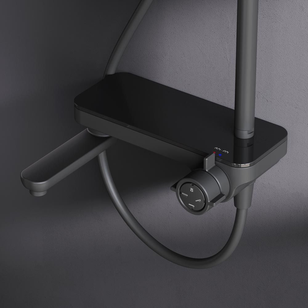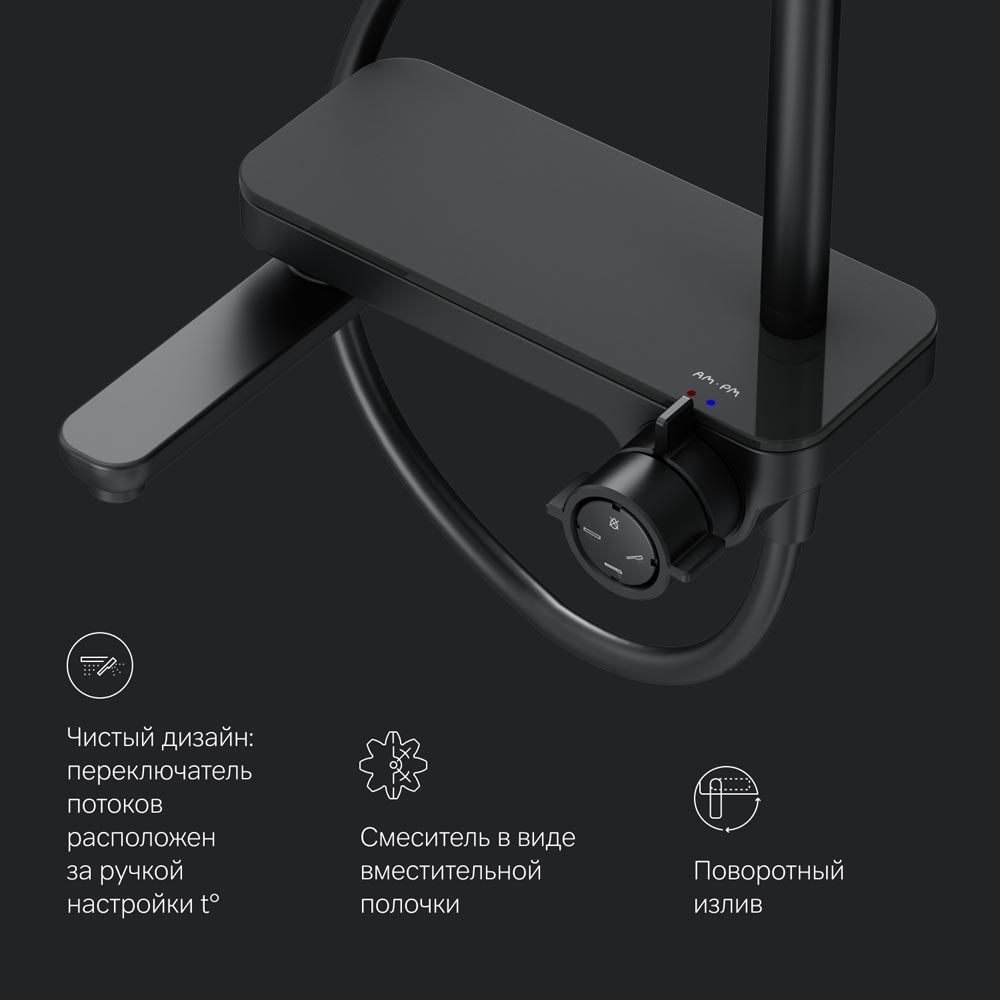 Смеситель выполнен в виде полочки. Чистый дизайн без лишних деталей: переключатель расположен за ручкой настройки температуры и позволяет менять источник потока воды от ручной лейки и излива до верхнего душа. ""