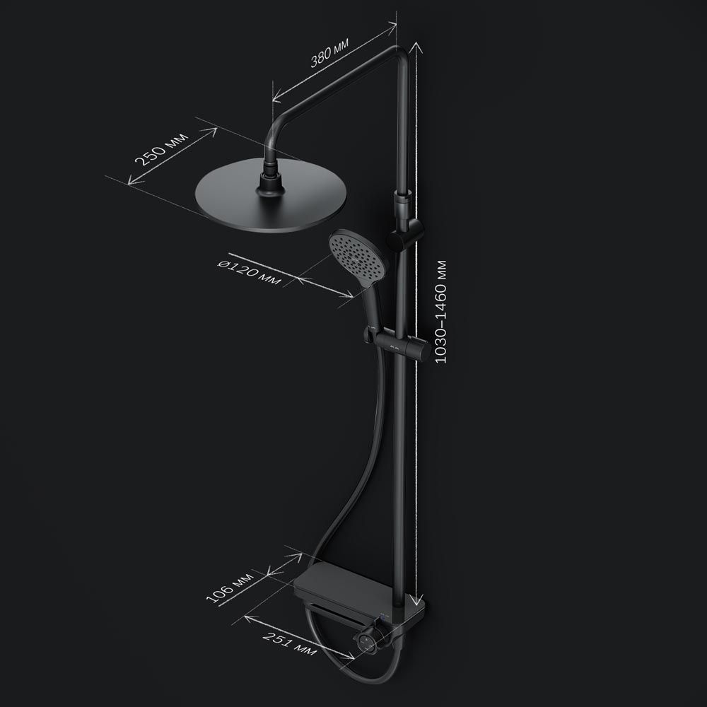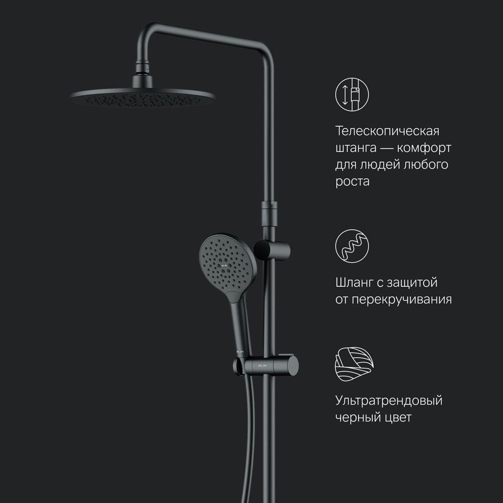 Премиальные размеры и продуманные детали: увеличенный диаметр душевых леек (верхний душ 220 мм и ручной душ 120 мм) позволит ощутить преимущества тропического душа тогда как увеличенная длина шланга 1750 мм обеспечит свободу движений во время принятия душа. Телескопическая поворотная штанга регулируется по высоте в диапазоне от 1030 до 1460 мм обеспечивая комфорт для людей любого роста а шаровой шарнир в держателе верхнего душа позволяет регулировать угол его наклона.