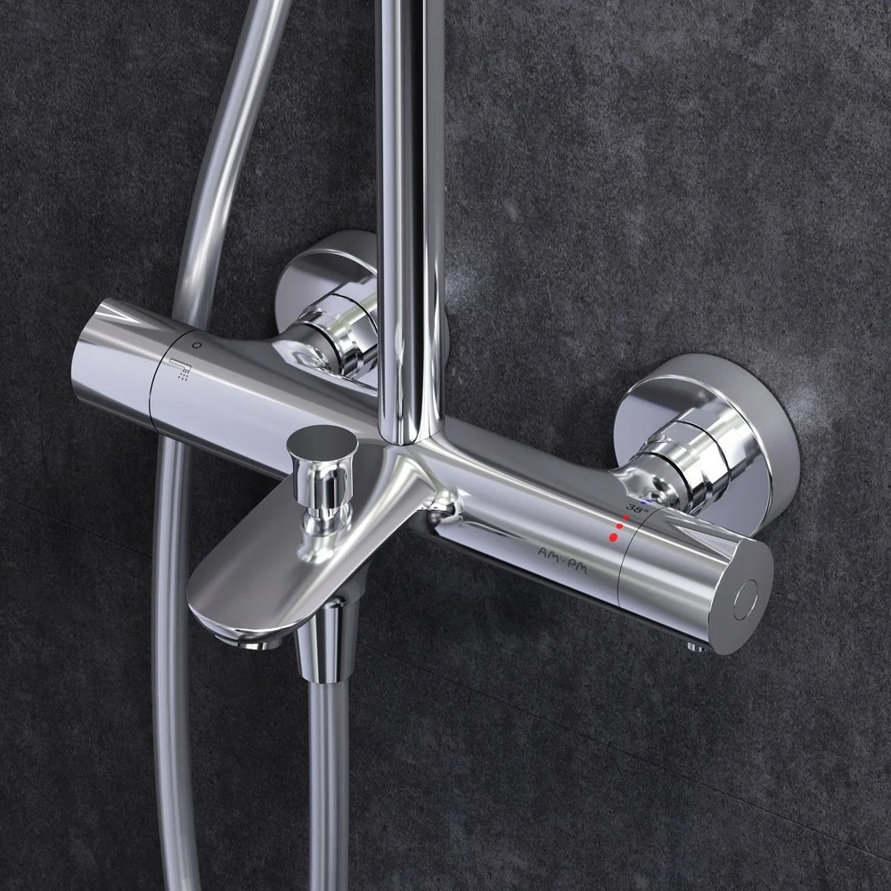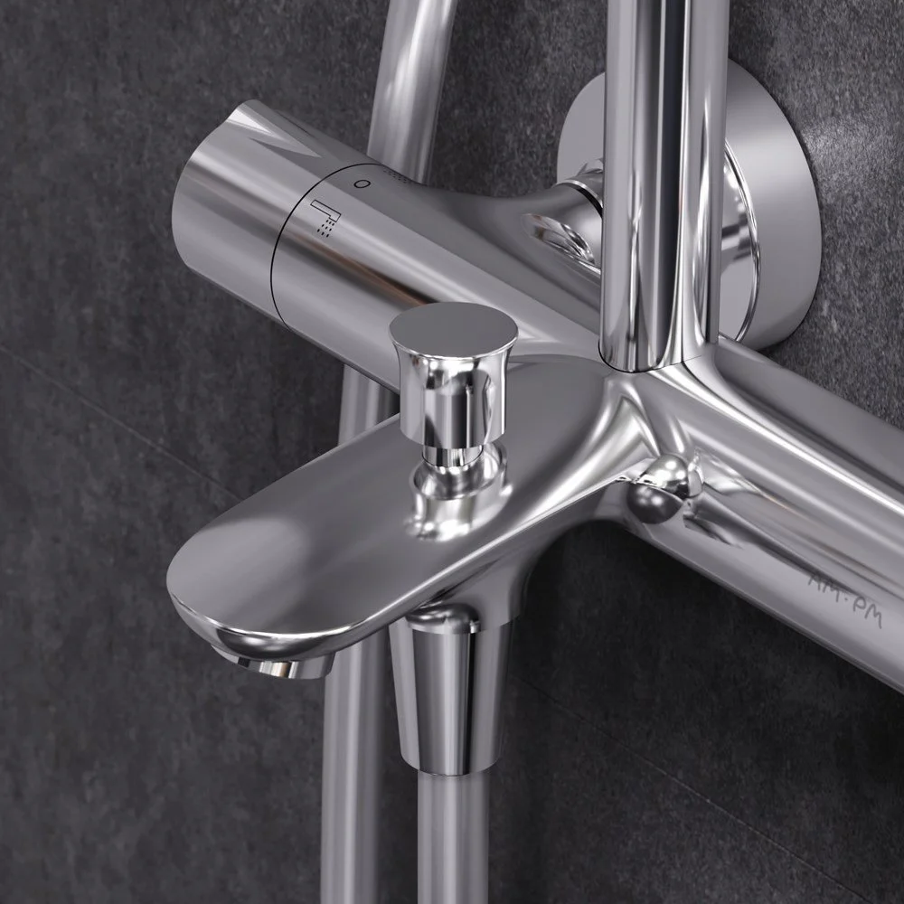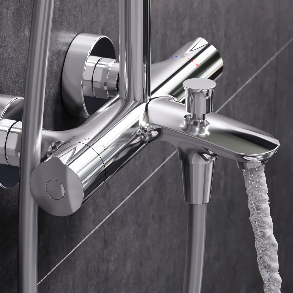 Смеситель для ванны и душа с термостатом: термостатический картридж с высокочувствительным термоэлементом стопором безопасности на 38 градусов быстрой реакцией на изменения температуры или давления надежно защищает от ожога даже при внезапном отключении холодной воды.