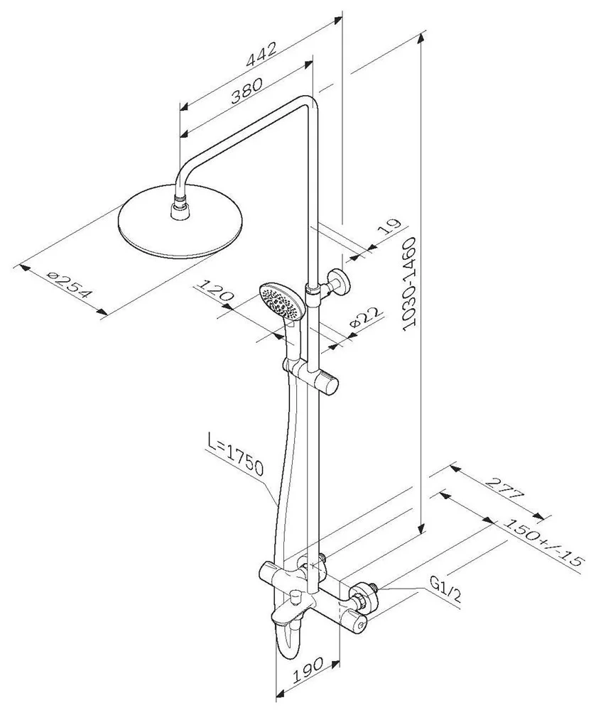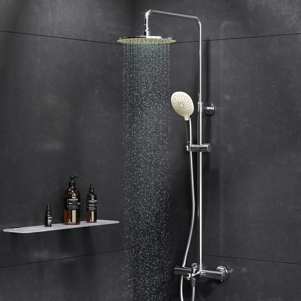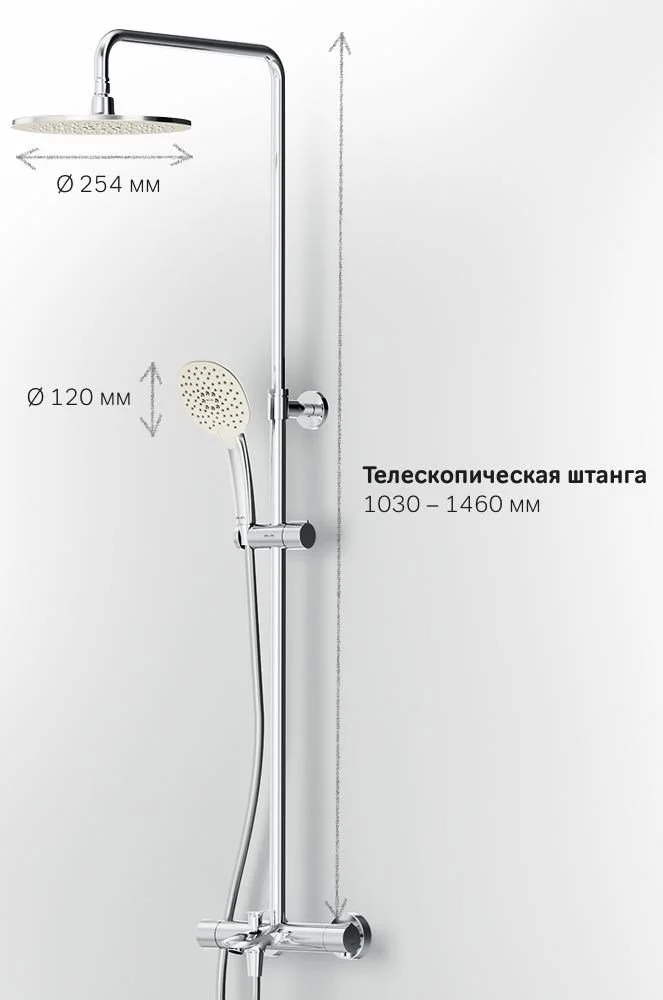 Продуманные детали для удобства использования: штанга регулируется по высоте в диапазоне от 880 до 1270 мм обеспечивая комфорт для людей любого роста шаровый шарнир в держателе верхнего душа позволяет регулировать угол его наклона душевой шланг 1750 мм верхний душ диаметром 254 мм ручной душ диаметром 120 мм.
