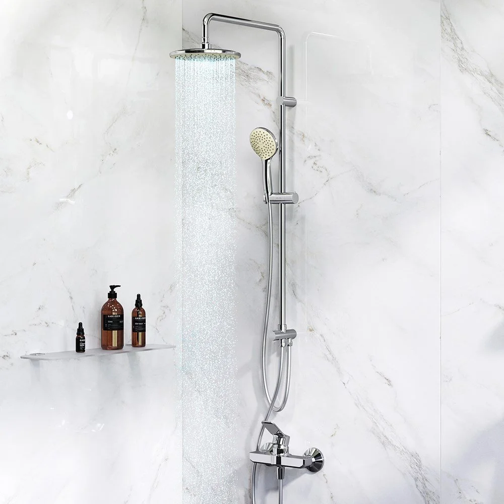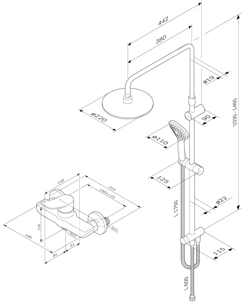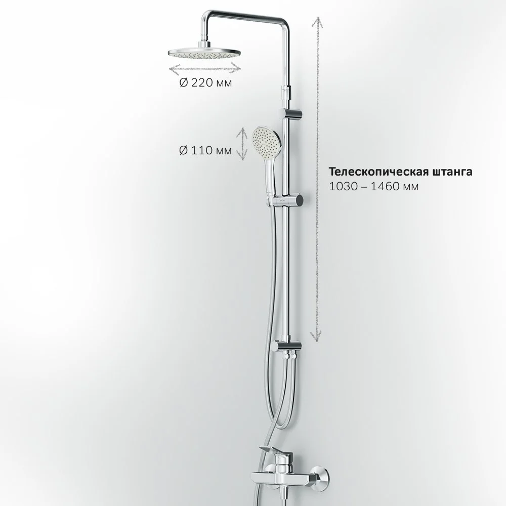 Функциональная душевая система. Поворотная и телескопическая душевая штанга позволит индивидуально настроить расположение верхнего душа в диапазоне от 1 030 мм до 1 460 мм. Широкий верхний душ 220 мм ручной душ 110 мм душевой шланг с защитой от скручивания. ""
