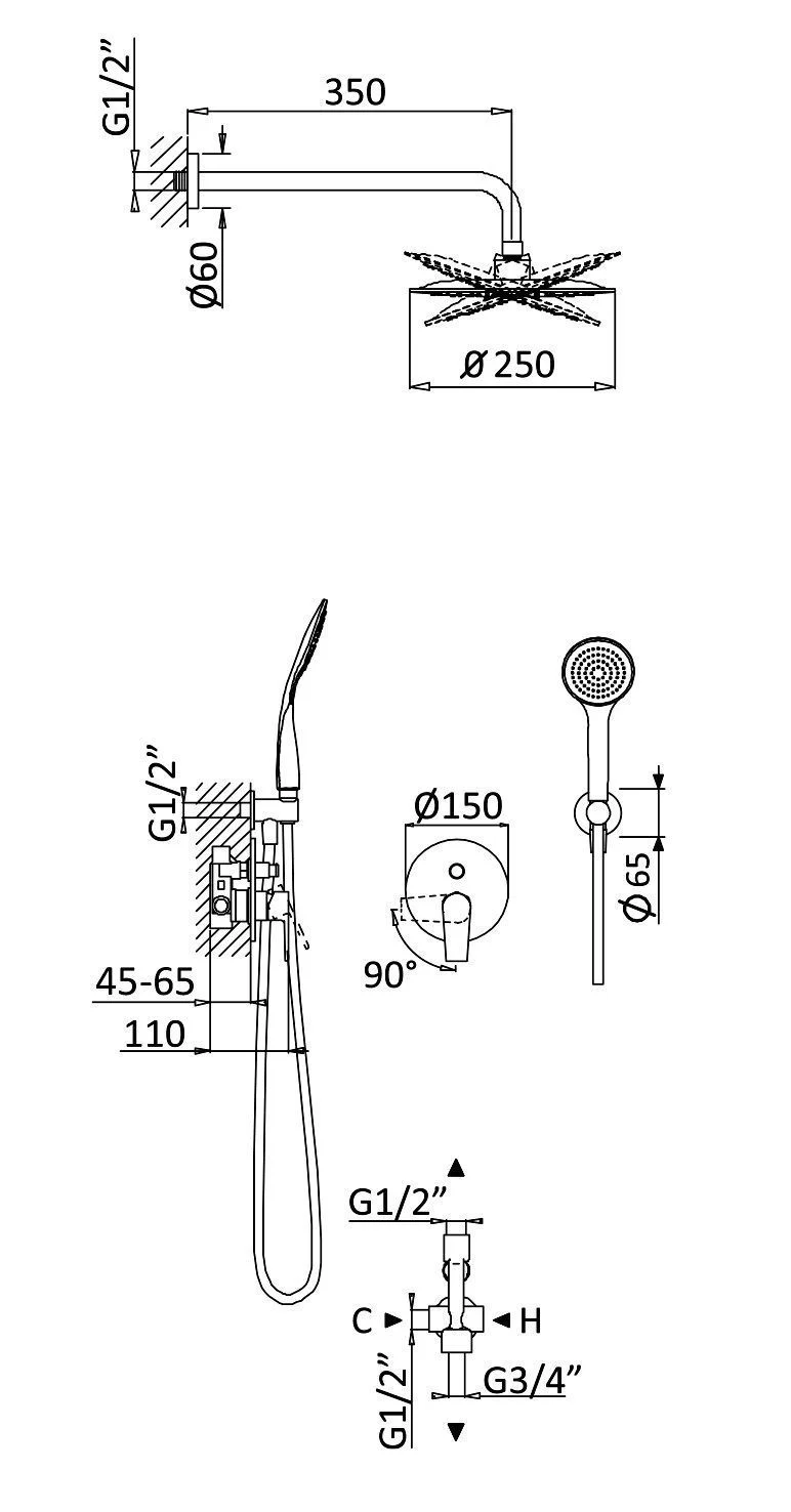 Душевой шланг, душевая лейка, переключатель потоков, держатель для душа