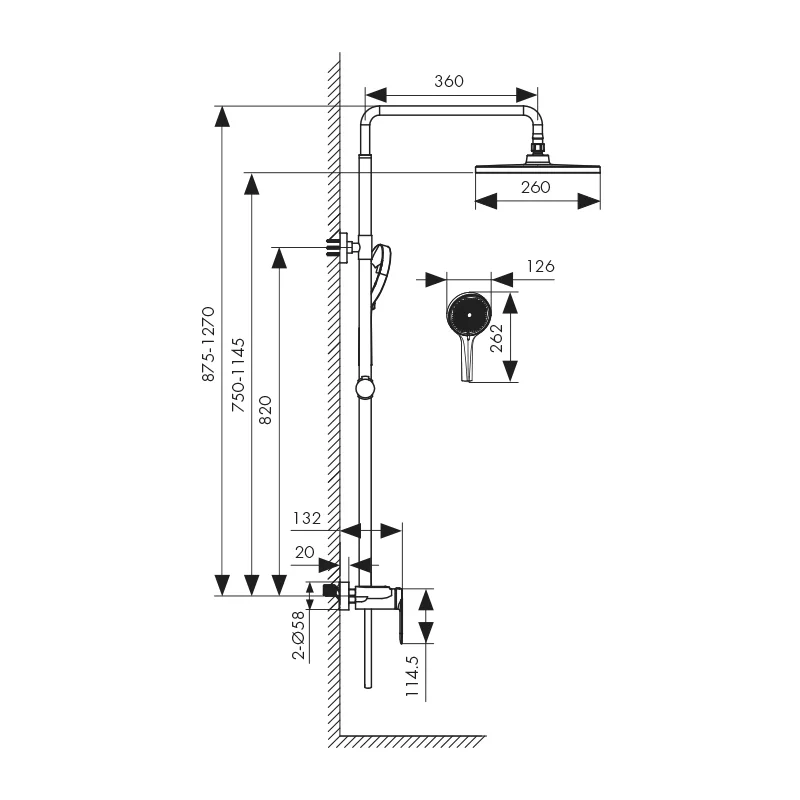 смеситель, релинг, верхний душ, душевая лейка, держатель лейки, шланг, крепления