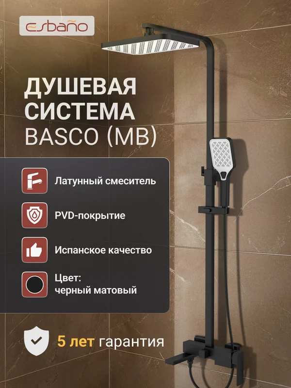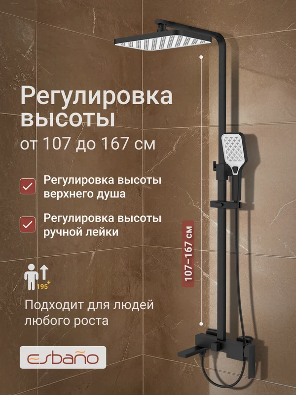 3-х режимная душевая система, телескопическая штанга (1070-1670), поворотный излив. Корпус смесителя - латунь. Надежный керамический картридж. Излив - нержавеющая сталь (# 304). Верхний душ и душевая лейка из ABS. Душевой шланг: PVD. Длина шланга - 1,5 м.