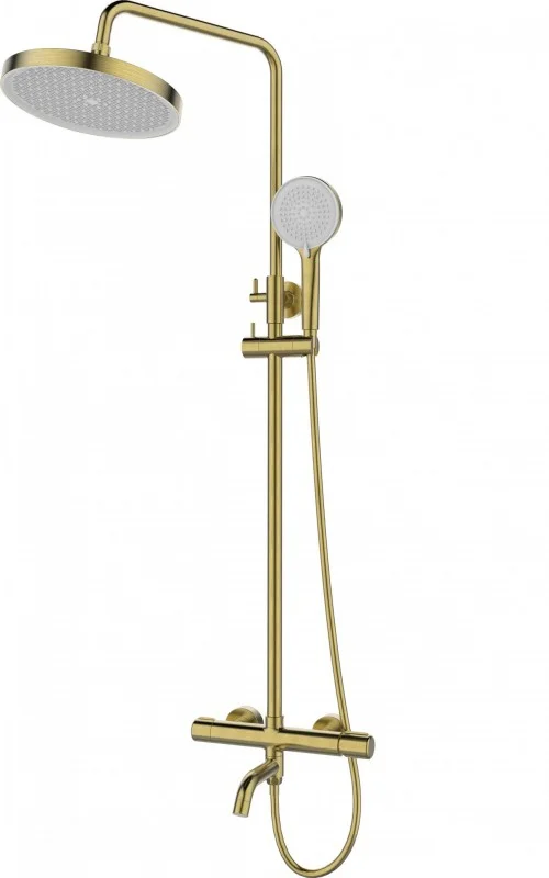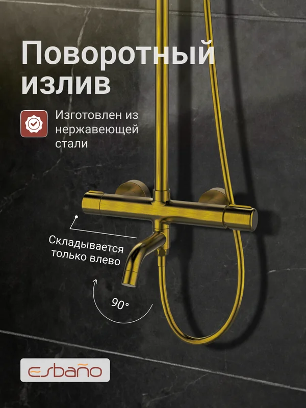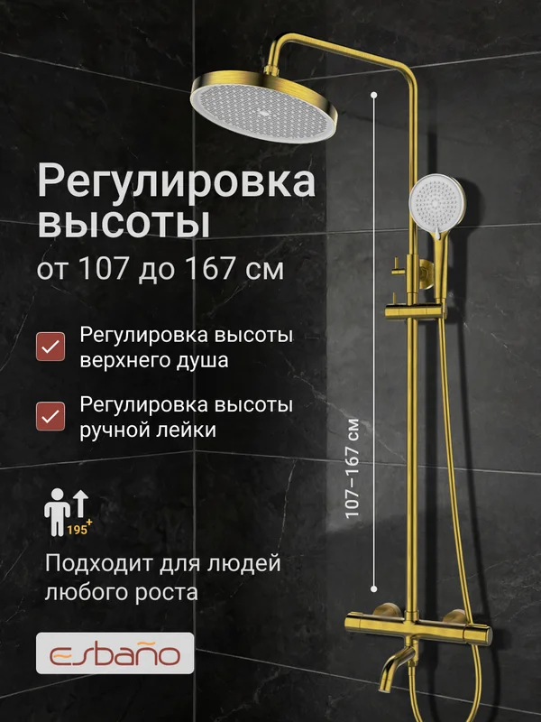 3-х режимная душевая система, телескопическая штанга (1068-1668), поворотный излив. Корпус смесителя - латунь. Надежный керамический картридж. Излив - нержавеющая сталь (# 304). Верхний душ и душевая лейка из ABS. Душевой шланг: PVD. Длина шланга - 1,5 м.