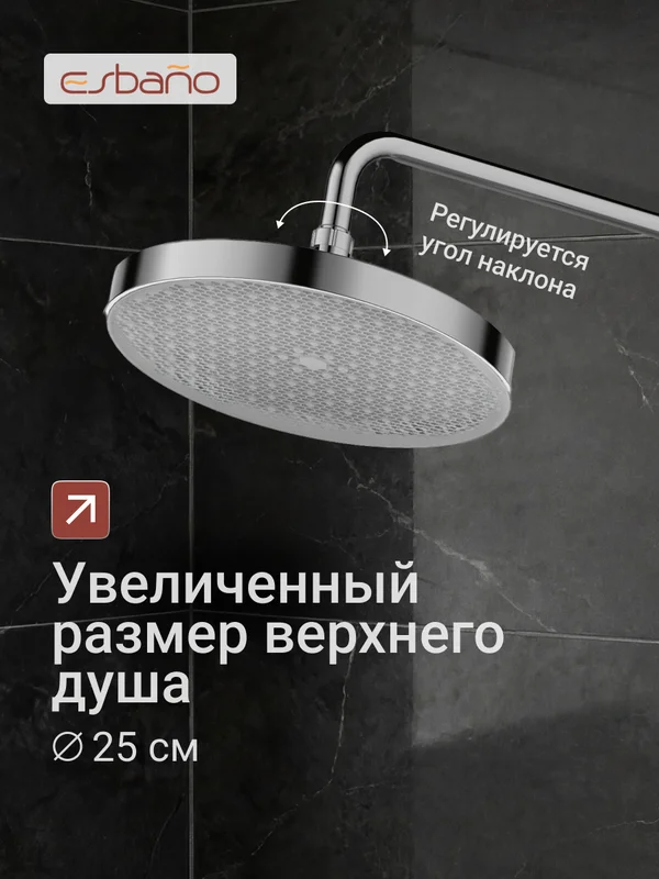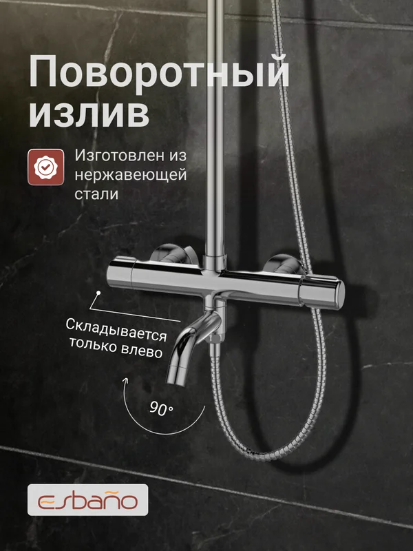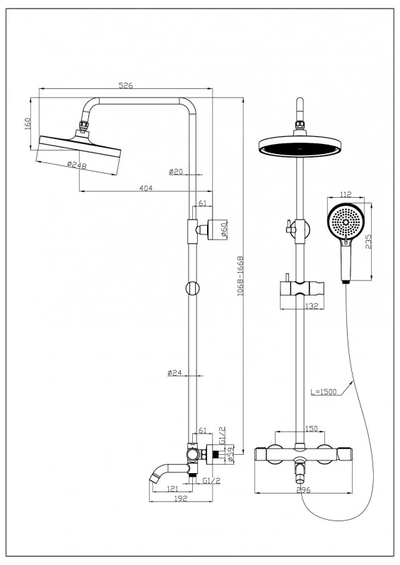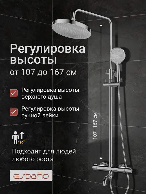 3-х режимная душевая система, телескопическая штанга (1068-1668), поворотный излив. Корпус смесителя - латунь. Надежный керамический картридж. Излив - нержавеющая сталь (# 304). Верхний душ и душевая лейка из ABS. Душевой шланг: стальная оплетка с 2-м замком. Длина шланга - 1,5 м.