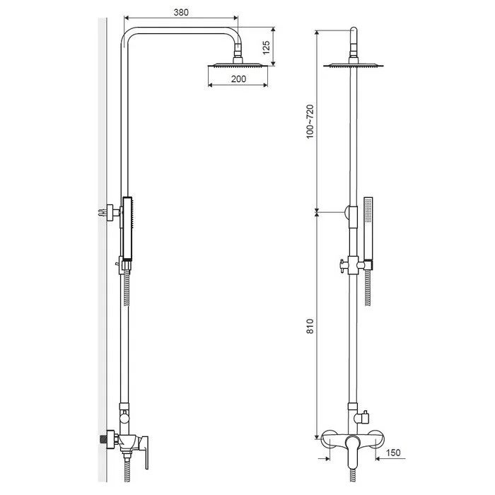 - верхний душ Ø20 см, отдаленность от стены: 38 см;