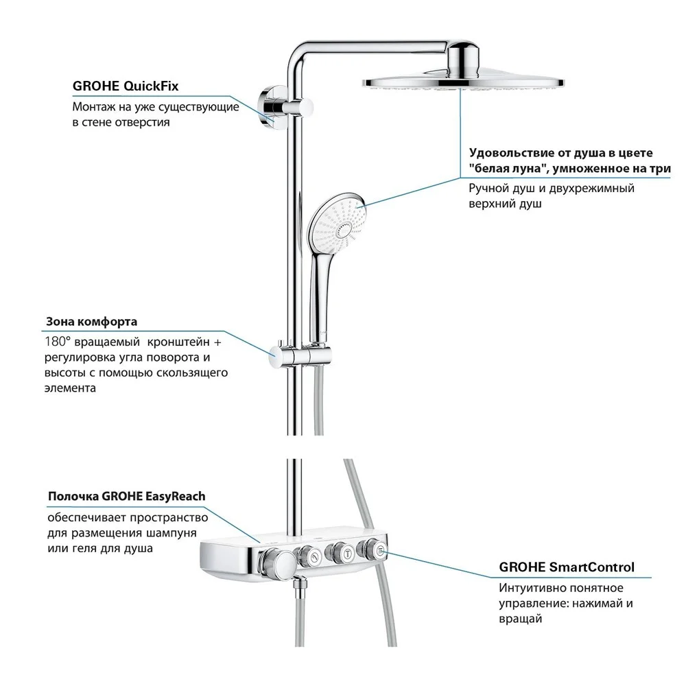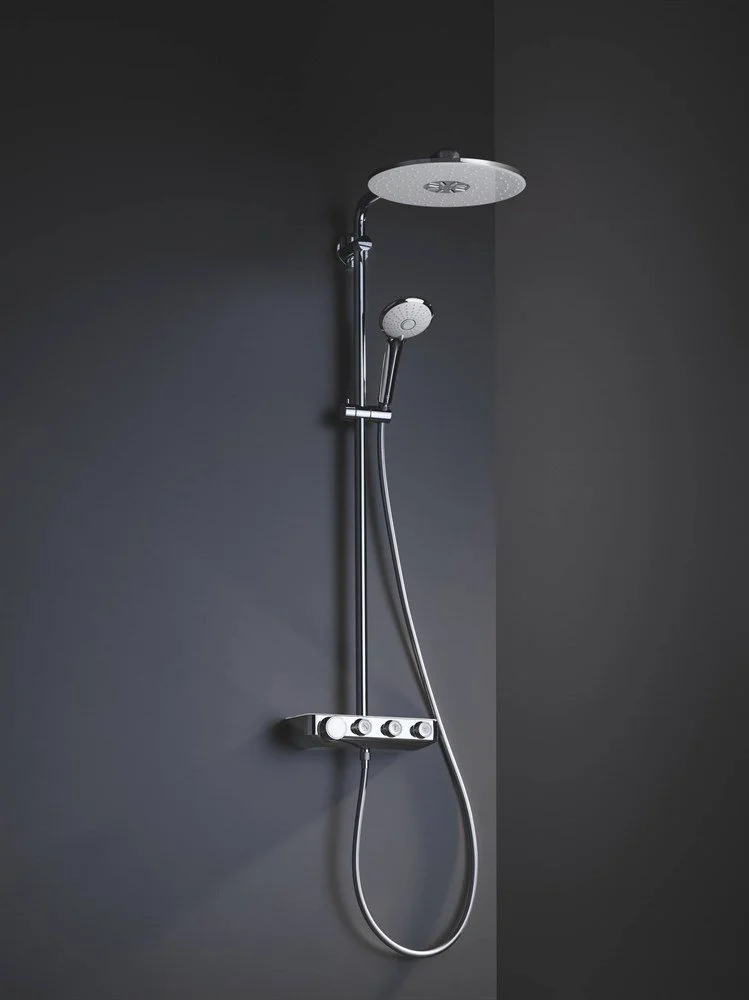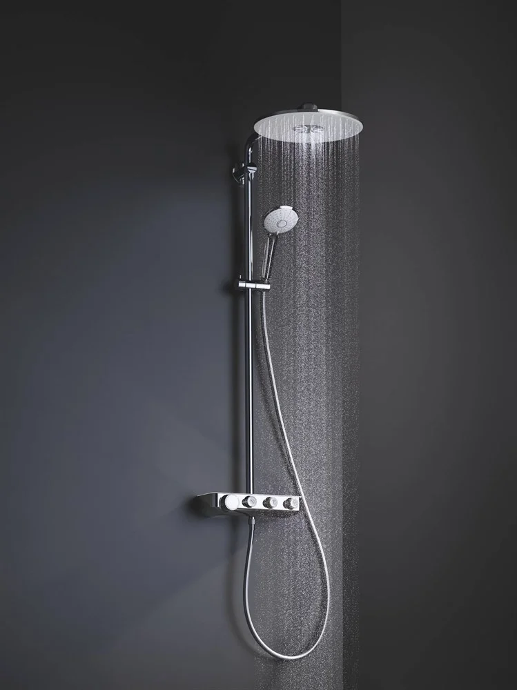 Инновационная технология GROHE SmartControl позволяет переключаться между режимами струи и комбинировать потоки верхнего и ручного душа, равно как и регулировать напор воды с помощью простого нажатия и поворота кнопки. Технология EcoJoy позволяет сократить расход воды.