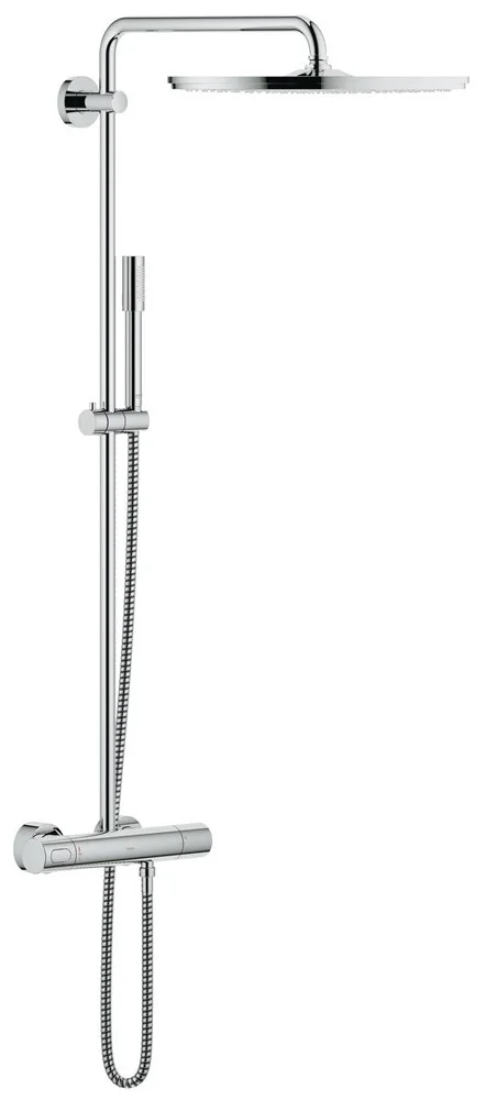Этот верхний душ размера XXL доставит Вам удовольствие мягким и широким потоком капель благодаря равномерному распределению воды через все форсунки. Он имеет шарнирное крепление к поворотному кронштейну, за счет чего Вы сможете легко поворачивать его в нужном направлении, создавая в своей душевой персональную зону комфорта. В комплектацию данной душевой системы также входит ручной душ в удлиненном тонком корпусе с интенсивным режимом струи и возможностью регулировки положения по высоте за счет скользящего держателя на штанге. Термостат системы, изготовленный по технологии GROHE TurboStat, обеспечивает мгновенную подачу воды заданной температуры и поддерживает эту температуру на постоянном уровне без колебаний. Технология GROHE CoolTouch предотвращает опасный нагрев внешней поверхности термостата. Встроенный механизм водосбережения сокращает расход воды почти вдвое, позволяя Вам полностью погружаться в наслаждение принятием душа с сознанием того, что Вы экономите при этом ценные природные ресурсы. Все душевые