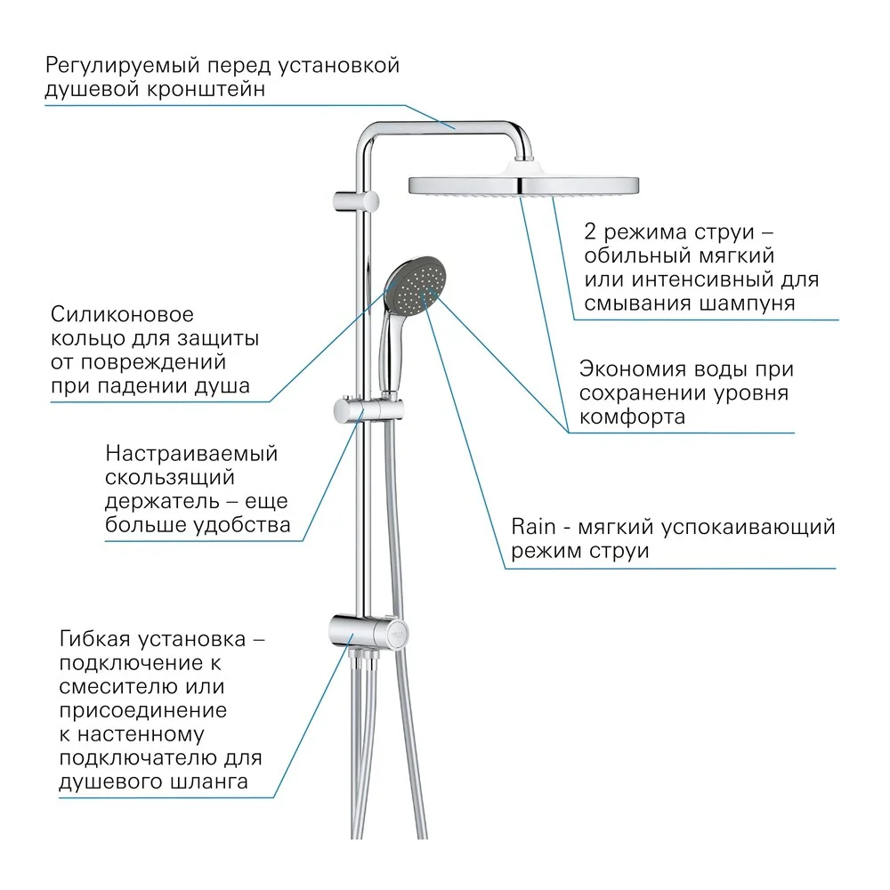 - 2 режима струи (с помощью переключателя): Rain, SmartRain