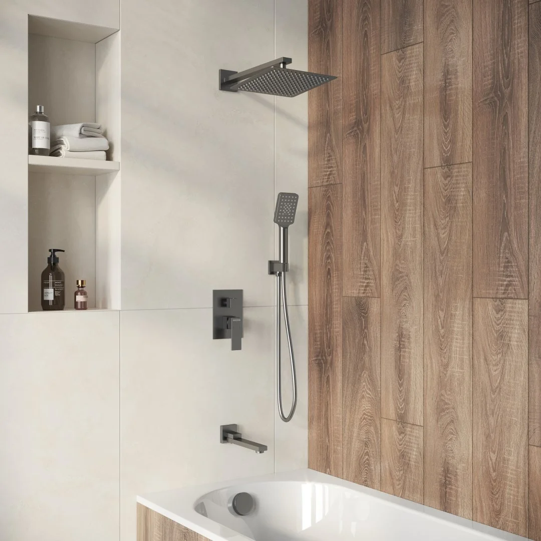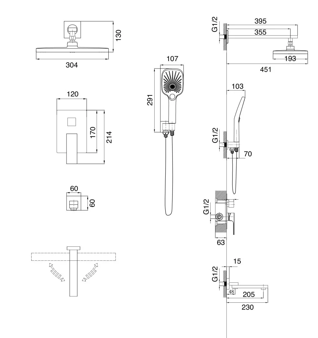 крепления, эксцентрики, настенный держатель, душевой шланг, душевая лейка, аэратор, вентиль, переключатель потоков