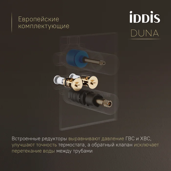 Надежная внутренняя инженерия: встроенные редукторы выравнивают давление ГВС и ХВС и улучшают точность термостата, обратный клапан исключает перетекание воды между трубами.