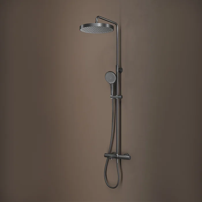 Душевая система с термостатом, тропическим и ручным душем и изливом Duna – воплощение актуальных трендов в дизайне смесителей в безупречном исполнении: фрезеровка, модные цвета и фактуры.