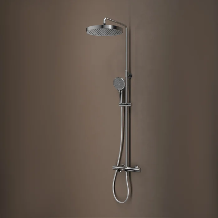 Душевая система с термостатом, тропическим и ручным душем и изливом Duna – воплощение актуальных трендов в дизайне смесителей в безупречном исполнении: фрезеровка, модные цвета и фактуры.