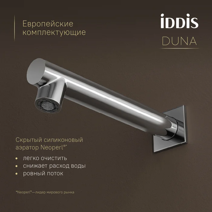 — Скрытый аэратор Neoperl® (Испания) не нарушает дизайн, формирует ровный поток и снижает расход воды. Ключ для обслуживания в комплекте.