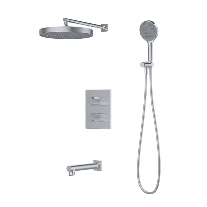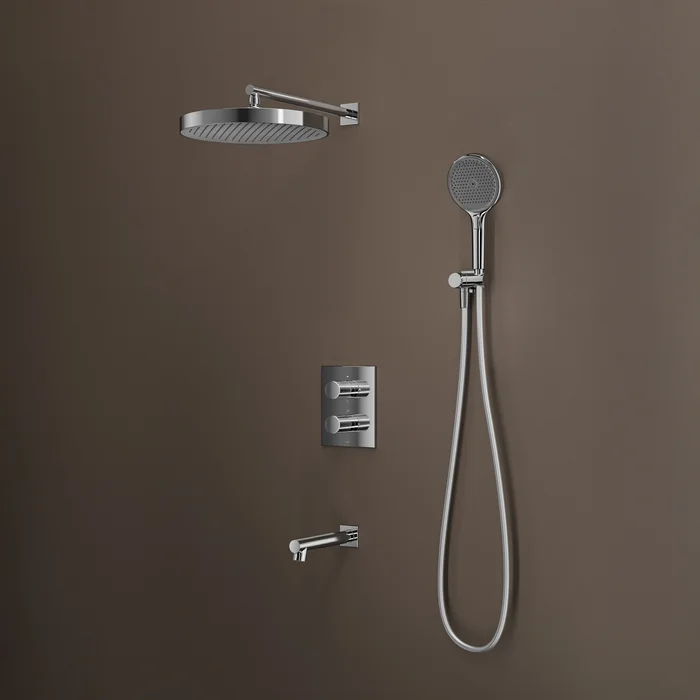 Встраиваемая душевая система с термостатом, тропическим и ручным душем и с изливом Duna – воплощение актуальных трендов в дизайне смесителей в безупречном исполнении: фрезеровка, модные цвета и фактуры.