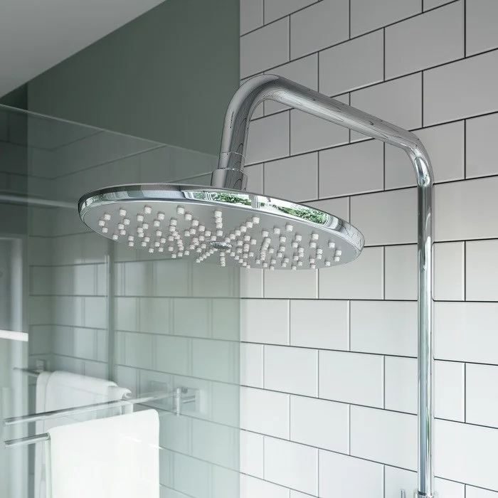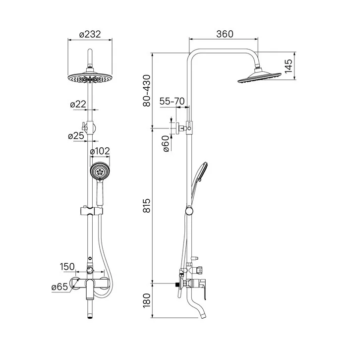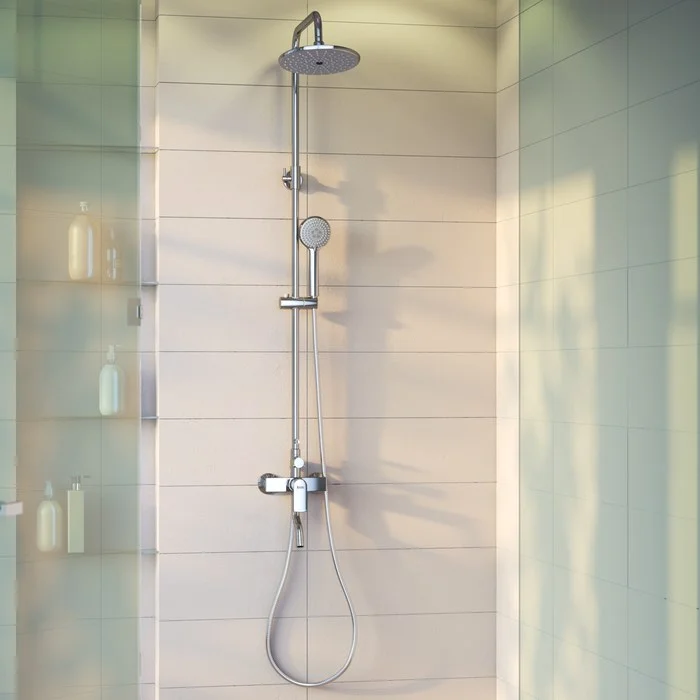 Смеситель для ванны с верхним душем, латунь, цвет - хром, керамический картридж Softap 35 мм, силиконовый аэратор Neoperl; верхняя лейка - 3 режима, диаметр 232 мм, ABS-пластик; ручная лейка - 3 режима, диаметр 102мм, ABS-пластик; держатель для ручной лейки - ABS-пластик; 3-х режимный керамический дивертор, пневматический дивертор для переключения режимов верхней лейки; шланг из ПВХ в оплетке из нержавеющей стали - 1,5 м; телескопическая душевая стойка с регулировкой высоты 895 - 1245 мм. Упаковка: кортонная коробка.