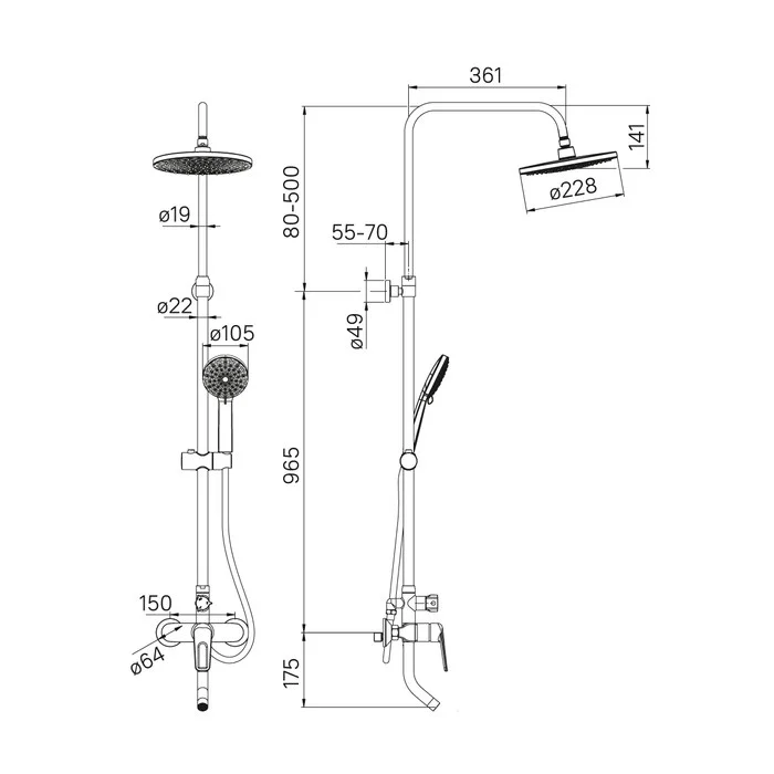 Смеситель для ванны с верхним душем, латунь, цвет - хром, керамический картридж Softap 35 мм, силиконовый аэратор Neoperl; верхняя лейка с функцией самоочистики - 1 режим, диаметр 228мм, ABS-пластик; ручная лейка - 3 режима, диаметр 105 мм, ABS-пластик; держатель для ручной лейки - ABS-пластик; 3-х режимный керамический дивертор; шланг из ПВХ в оплетке из нержавеющей стали - 1,5 м; телескопическая душевая стойка с регулировкой по высоте 868 - 1218 мм. Упаковка: кортонная коробка.