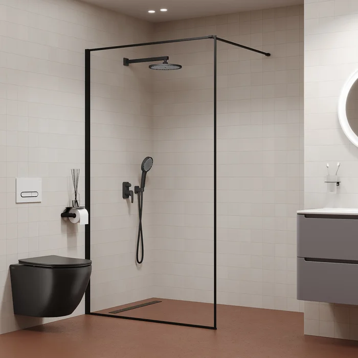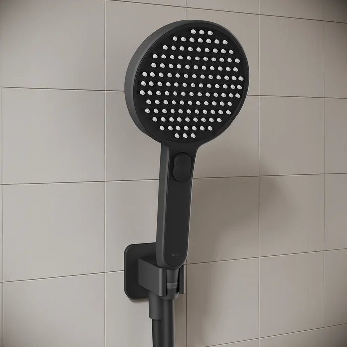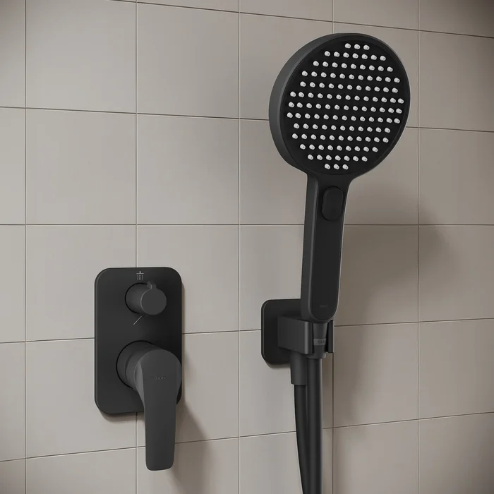 Душевая система Optima Home в стильном черном цвете для обустройства комфортной душевой включает все необходимое: смеситель с удобной ручкой и поворотным дивертором на 2 положения, верхнюю лейку d=25,4 см для тропического душа с кронштейном (40 см), ручную лейку d=13 см с 3 режимами и переключением кнопкой, гладкий силиконовый шланг (2 м).