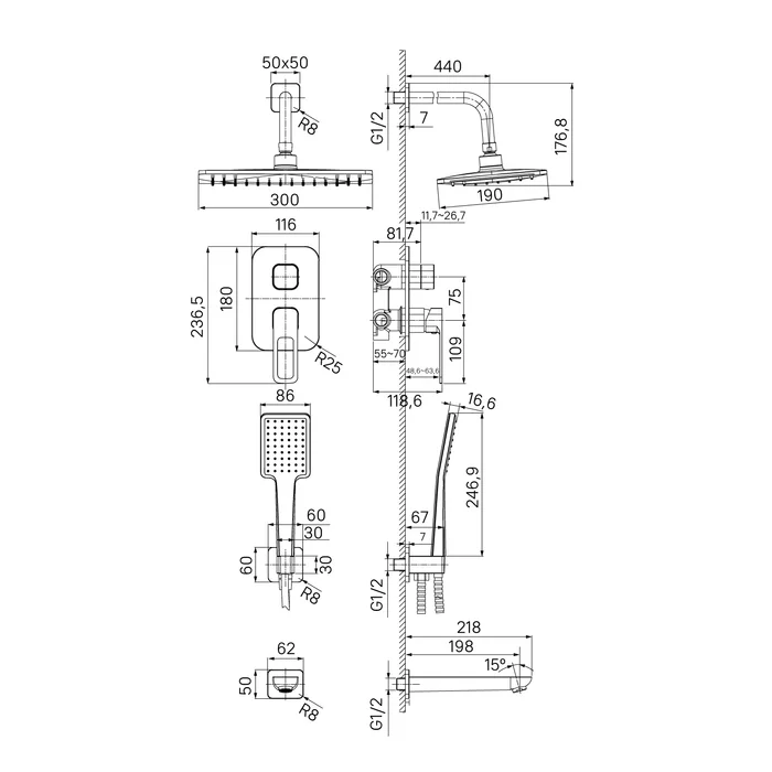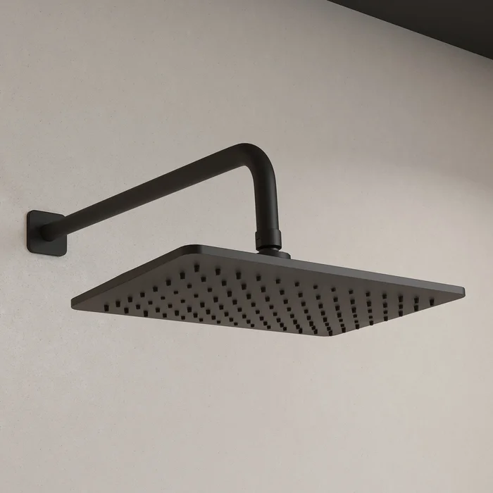 Оптимальная подборка Slide: смеситель, верхняя лейка с кронштейном для тропического душа, излив, ручная лейка, душевой шланг и выход для шланга с держателем для лейки.