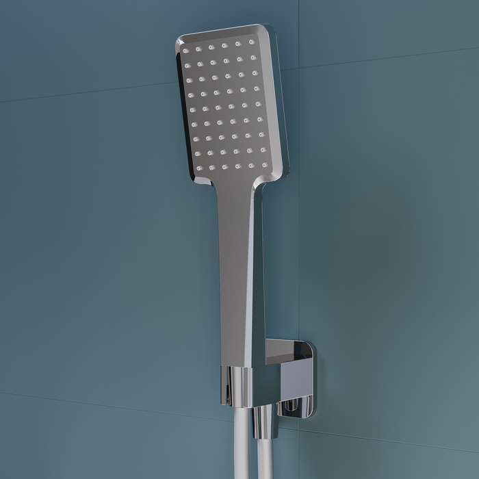 Оптимальная подборка Slide: смеситель, верхняя лейка с кронштейном для тропического душа, излив, ручная лейка, душевой шланг и выход для шланга с держателем для лейки.