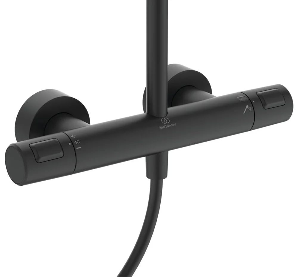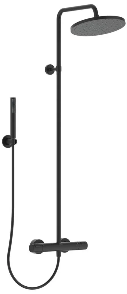 Ceratherm T25 Душевая система в комплекте с термостатическим смесителем для душа (монтаж на стандартных эксцентриках, термостатический картридж IS, новая технология, затворы на керамических дисках G1/2 180?, технология "Cool body" ("Холодный корпус"), пластиковые рукоятки с ограничителями температуры (40oC) и потока воды (50%), встроенный обратный клапан), металлический верхний душ 300 мм, ограничение потока 12 л/мин., душевая лейка Stick, шланг 1750 мм