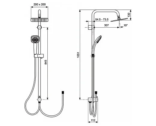 IDEALRAIN CUBE Душевая система для установки с настенным смесителем; 3-функциональная душевая лейка 100 мм (B0003AA), ограничение потока 8 л/мин. (пластик); ультратонкий верхний душ 200х200 мм, шарнирное соединение, ограничение потока 12 л/мин. (латунь); душевая труба O25 мм для верхнего душа (латунь), ручное переключение; пластиковый слайдер, металлические крепления к стене; шланг для душа IdealFlex 1750 мм (пластик). Смеситель заказывается дополнительно