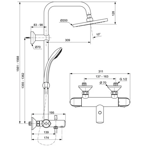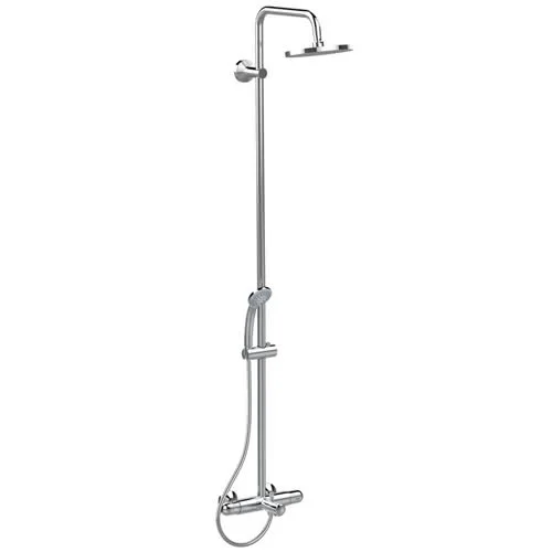 IDEALRAIN ECO Душевая система в комплекте с настенным термостатическим смесителем для ванны/душа с двумя выходами Ceratherm 25; 3-функциональная душевая лейка 80 мм (B9401AA), ограничение потока 8 л/мин.; верхний душ 200 мм, ограничение потока 12 л/мин, пластик, шаровое соединение; душевая труба O25 мм для верхнего душа, ручное переключение, пластиковый слайдер, металлические крепления к стене; металлический шланг для душа 1500 мм