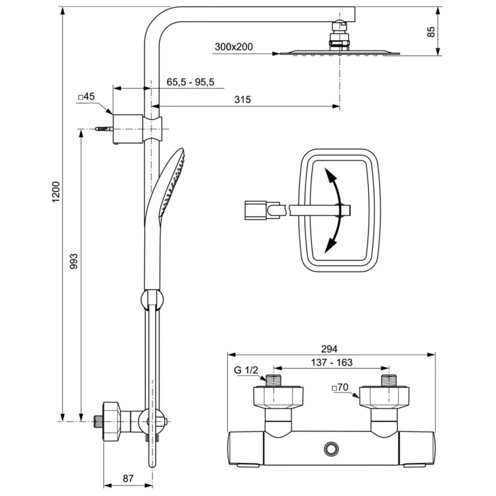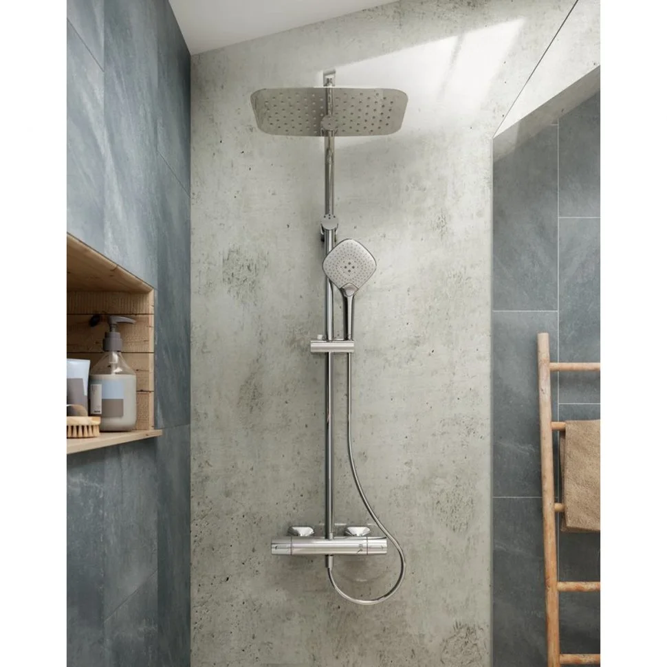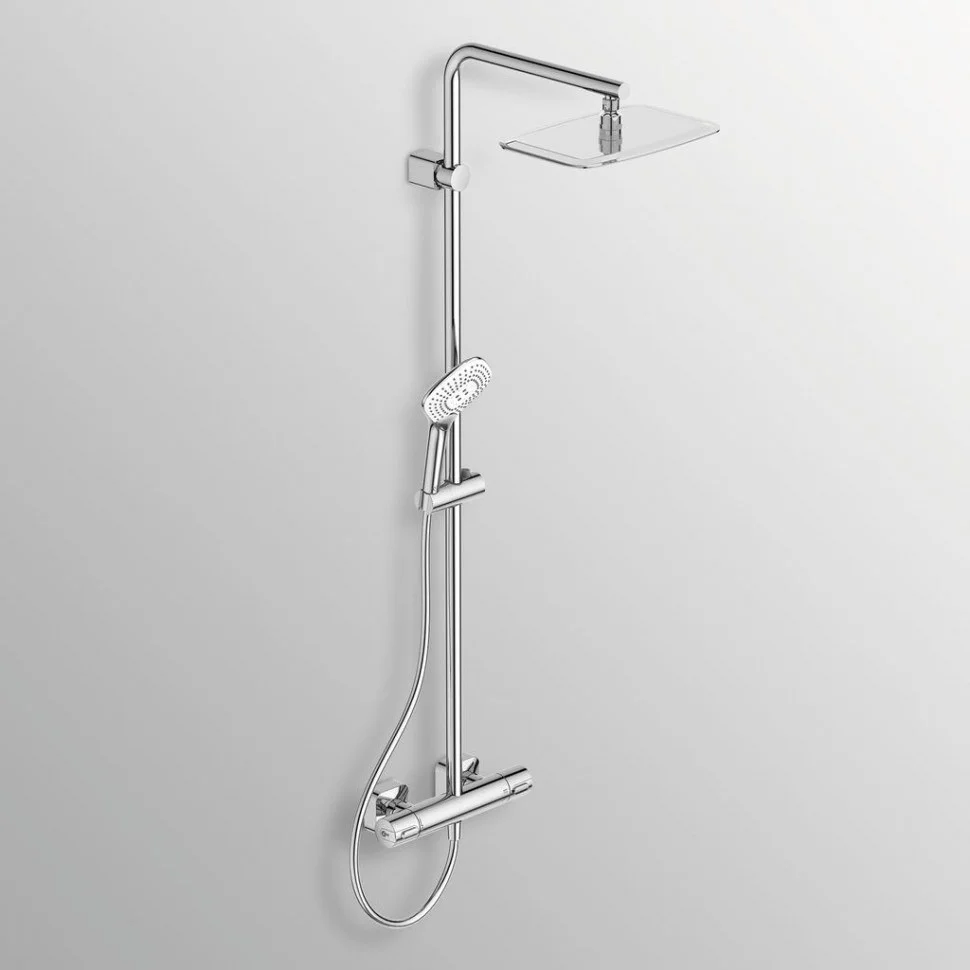 IDEALRAIN LUXE CUBE EVO JET Душевая система в комплекте с настенным термостатическим смесителем для душа с двумя выходами Ceratherm 100; 3-функциональная душевая лейка EVO JET ROUND O125 мм, ограничение потока 8 л/мин.; ультратонкий верхний душ 200х300 мм, ограничение потока 12 л/мин, нержавеющая сталь, шаровое соединение; душевая труба O25 мм для верхнего душа, ручное переключение, пластиковый слайдер, металлические крепления к стене; пластиковый шланг IdealFlex 1750 мм