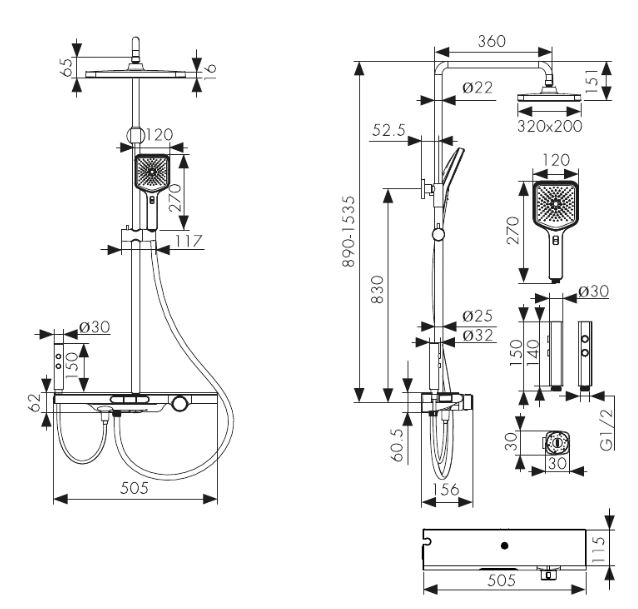 смеситель, релинг, верхний душ, душевая лейка, держатель лейки, шланг, крепления