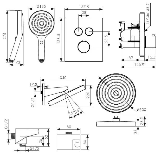 смеситель скрытого монтажа, скрытая монтажная часть, кронштейн для верхнего душа, лейка для верхнего душа, настенное соединение шланга с поворотным держателем для лейки, ручная лейка, шланг для душа, крепления