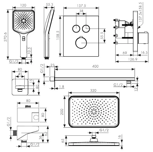 смеситель скрытого монтажа, скрытая монтажная часть, кронштейн для верхнего душа, лейка для верхнего душа, настенное соединение шланга с поворотным держателем для лейки, ручная лейка, шланг для душа, крепления