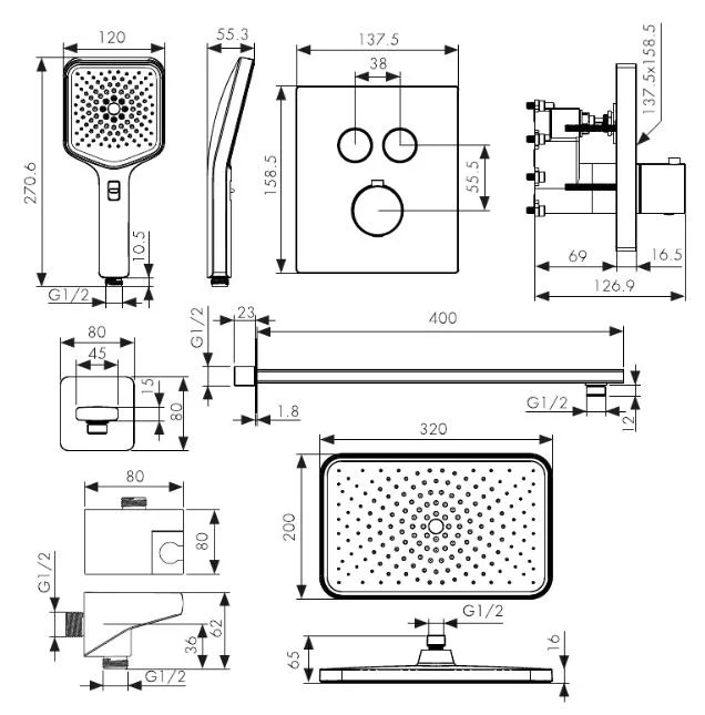 смеситель скрытого монтажа, скрытая монтажная часть, кронштейн для верхнего душа, лейка для верхнего душа, настенное соединение шланга с поворотным держателем для лейки, ручная лейка, шланг для душа, крепления
