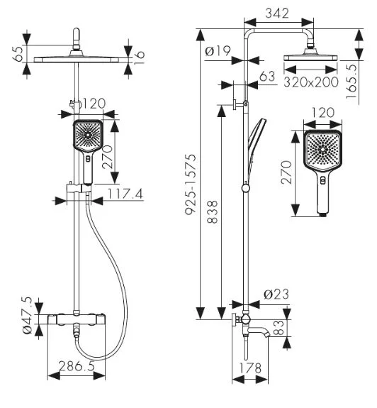 смеситель, релинг, верхний душ, душевая лейка, держатель лейки, шланг, крепления