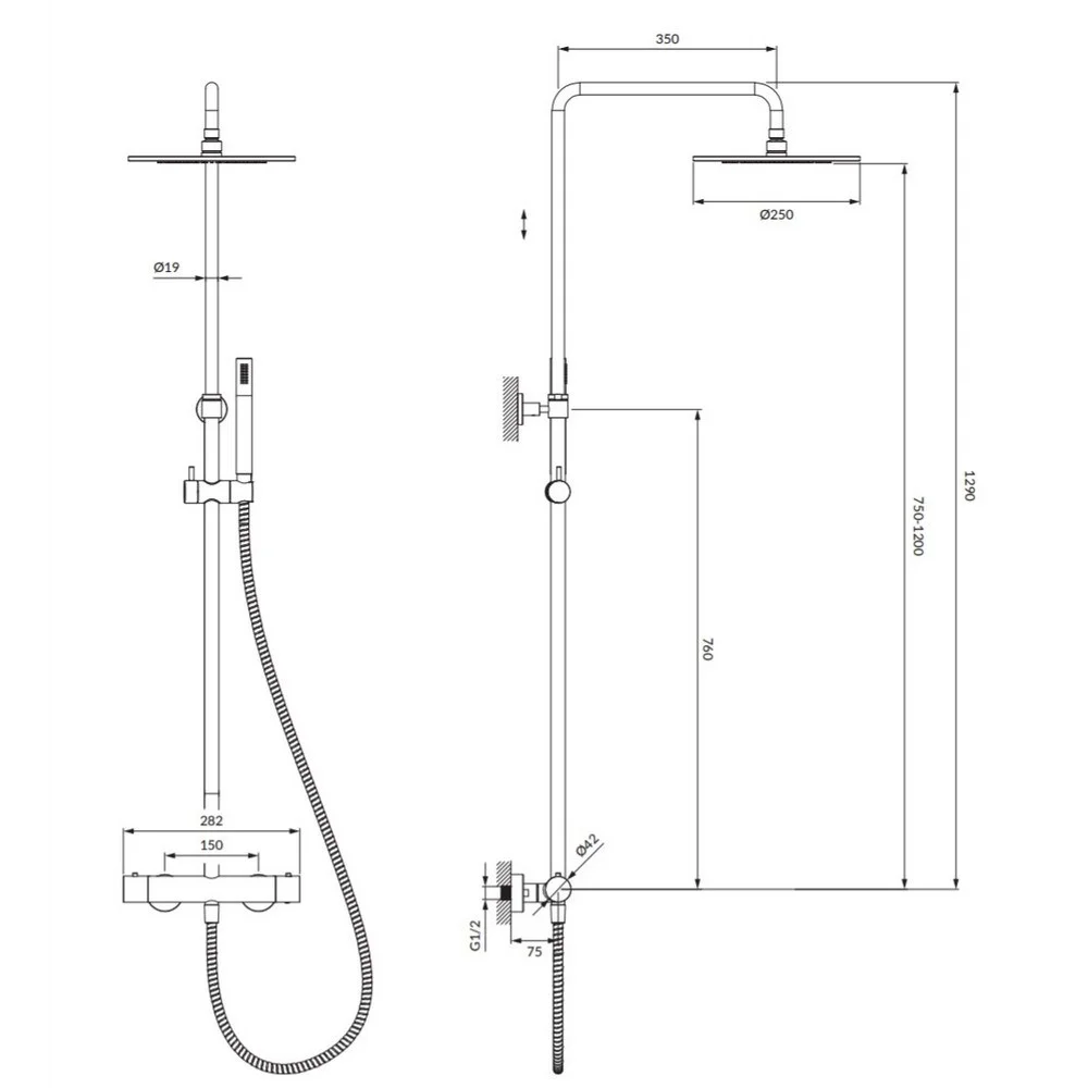 - верхний душ латунный, размер: ø25 см, отдаленность от стены: 35 см;
