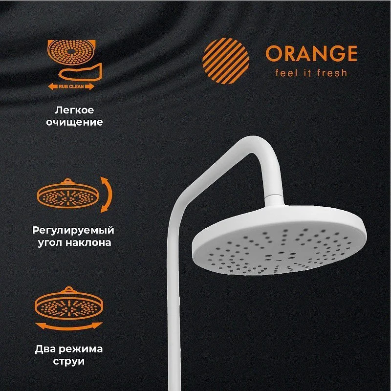 Душевая система Orange Lutz со смесителем для ванны/душа в цвете глянцевый белый. Верхний душ (d200 мм - 2 режима) создаёт эффект тропического дождя, что дарит непередаваемые эмоции во время ежедневных процедур. Ручной душ 100 мм (3 режима) на гибком полутораметровом шланге (в металлической оплетке) с защитой от перекручивания. Держатели верхнего и ручного душа с регулировкой угла наклона. Штанга 970 мм с подвижным держателем (возможность установки в старые отверстия).