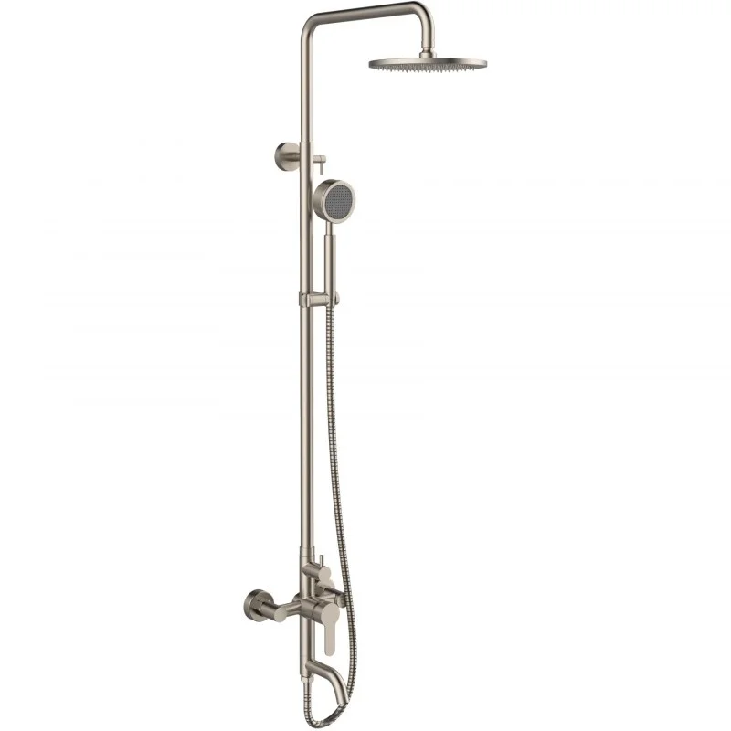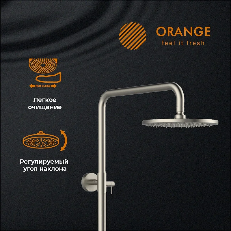Душевая система Orange Steel в комплекте: однозахватный смеситель для ванны с керамическим картриджем и поворотным изливом (179 мм); верхний душ d 200 мм с регулировкой угла наклона (с силиконовыми наконечниками для просто удаления известкового налёта), ручной душ d80 мм (1 режим), регулируемый по высоте и наклону держатель ручного душа, шланг 1,5 м (в металлической оплетке) с защитой от перекручивания, штанга 1117 мм. Переключение на душ осуществляется поворотом излива. Цвет матовый никель.