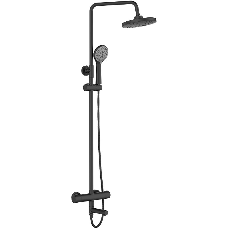 Душевая система Orange Thermo: термостат с поворотным изливом 118 мм (управление осуществляется с помощью двух стильных ручек: левая - регулирует напор воды, правая - управляет температурой, создавая идеальные условия для принятия водных процедур); телескопическая штанга 865-1250 мм; двухрежимный верхний душ (d 225 мм) с регулировкой угла наклона и силиконовыми форсунками (защита от известкового налета); ручной душ d 100 мм (3 режима); регулируемый по высоте и углу наклона держатель ручного душа; шланг 1500 мм в металлической оплетке, с защитой от перекручивая. Цвет матовый черный, за которым просто ухаживать мягкой салфеткой, получен методом порошковой окраски с многоступенчатой системой подготовки и высокотемпературной обработкой.