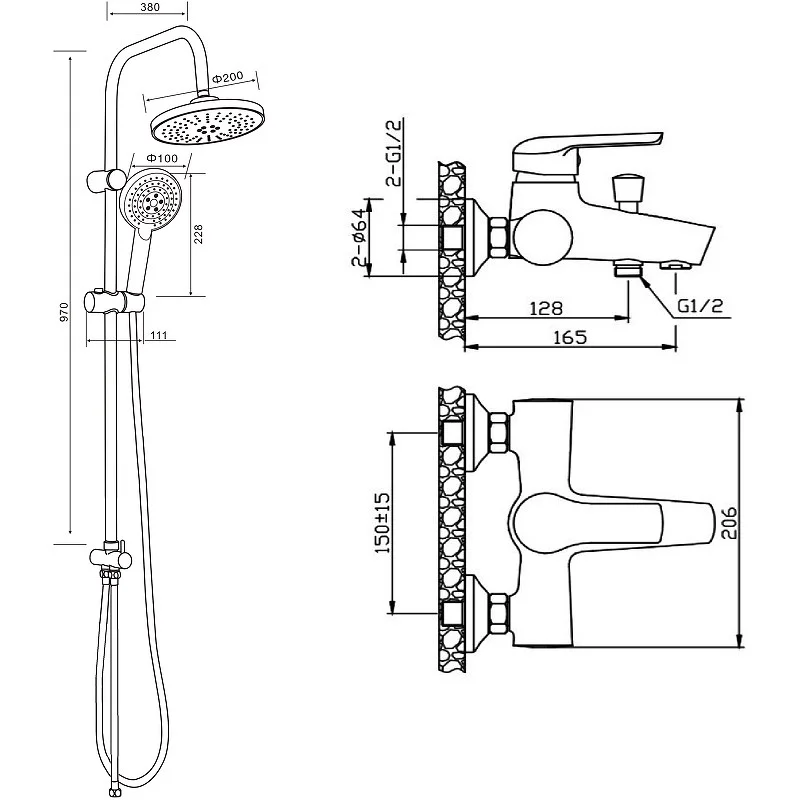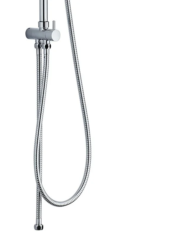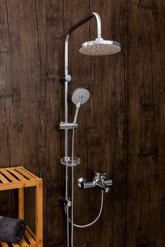 Душевая система Orange Tony в комплекте: однозахватный смеситель для ванны с керамическим картриджем и изливом (165 мм), верхний душ d 200 мм (2 режима струи, с регулировкой угла наклона) с силиконовыми наконечниками для просто удаления известкового налёта, ручной душ d 100 мм (3 режима) с регулируемым по высоте и наклону держателем, шланг 1,5 м (в металлической оплетке, с защитой от перекручивания), штанга 970 мм с возможностью установки в старые отверстия. Цвет глянцевый хром.