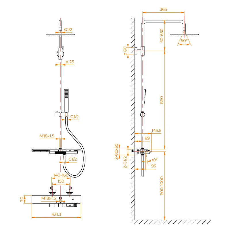Головной душ из нержавеющей стали оснащён со шарнирным креплением, что позволяет выбрать необходимый угол направления воды;
