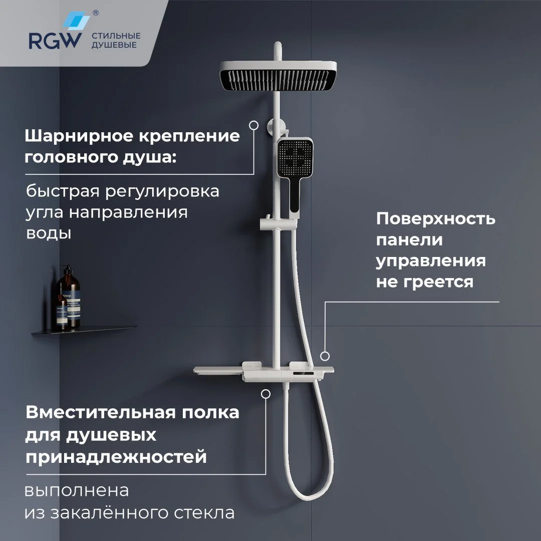 Головной душ из высокопрочного ABS-пластика оснащён со шарнирным креплением, что позволяет выбрать необходимый угол направления воды;