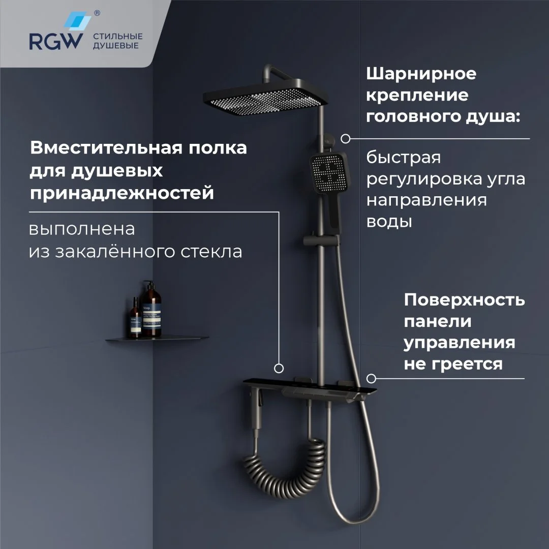 Головной душ из высокопрочного ABS-пластика оснащён со шарнирным креплением, что позволяет выбрать необходимый угол направления воды;