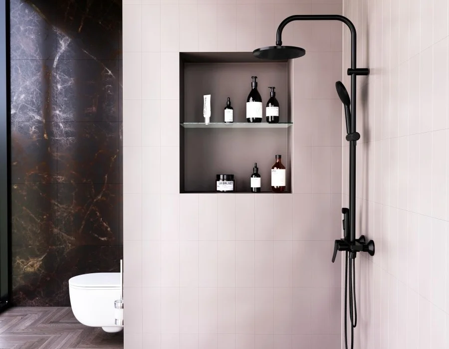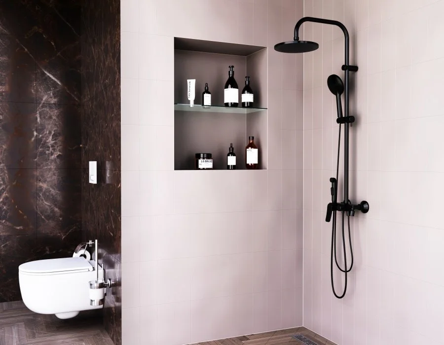 Стиль: сочетание множества аксессуаров душевой системы и трендового черного матового цвета по истине станут стильным атрибутом вашей ванной комнаты.