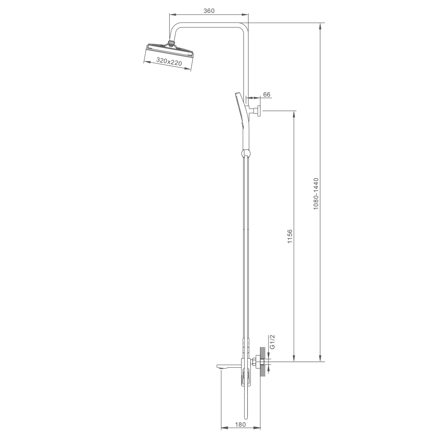 • Регулируемая душевая штанга: 1080-1440 мм