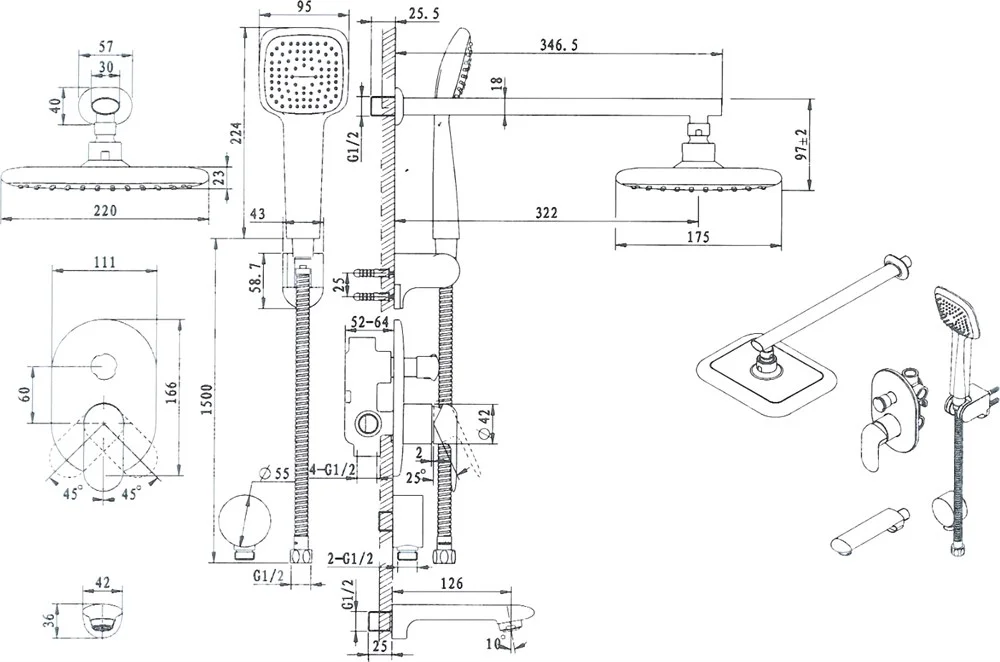 настенный держатель,шланговое подключение,верхний душ,излив,смеситель для душа