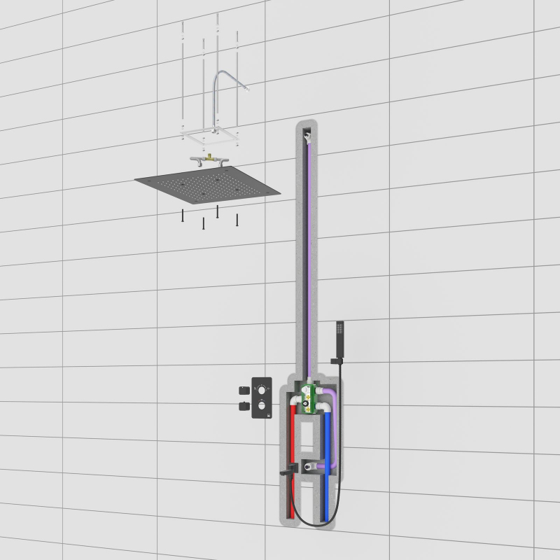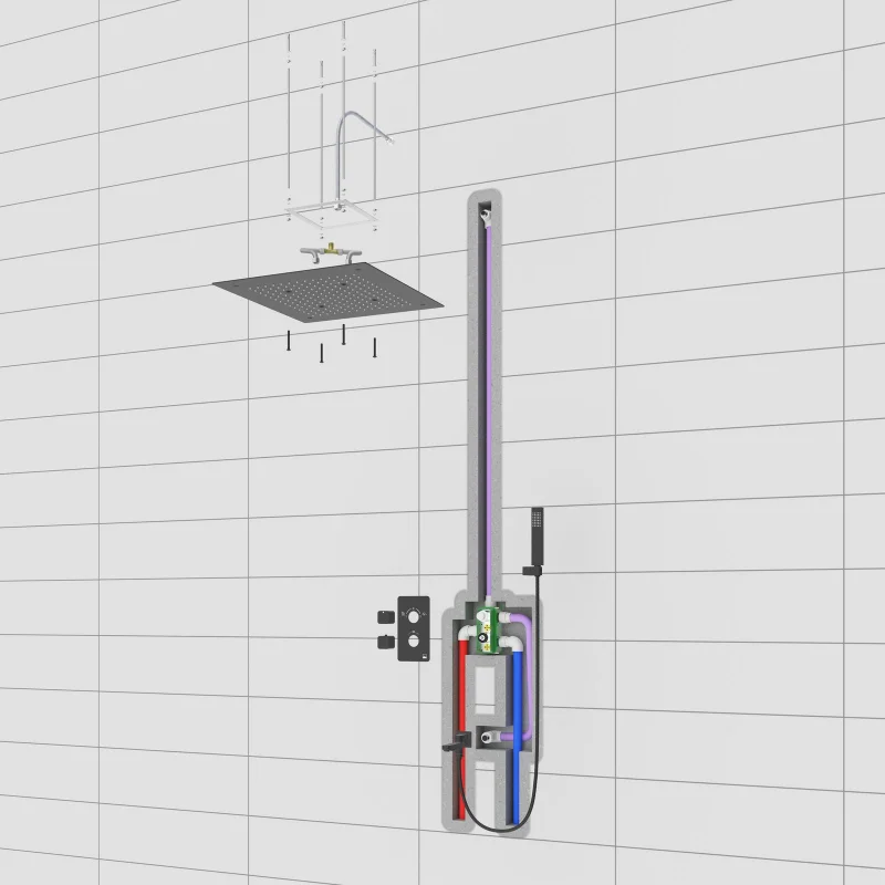 Подводка к тропическому душу - 1 шт., Крепежные винты с гайками (комплект) - 4 шт., Металлическая пластина - 1 шт., Муфты с резьбой - 4 шт., Лейка тропического душа - 1 шт., Крепежные винты - 4 шт., Ручной душ (латунный) - 1 шт., Держатель ручного душа - 1 шт., Шланг душа 1,5 м (латунный) - 1 шт., Встраиваемый блок смесителя - 1 шт., Декоративная накладка (латунная) - 1 шт., Ручка переключения режимов "ручной душ", "тропический душ" - 1 шт., Ручка управления термостатом - 1 шт., Излив с подключением шланга душа (латунный) - 1 шт., Инструкция - 1 шт.