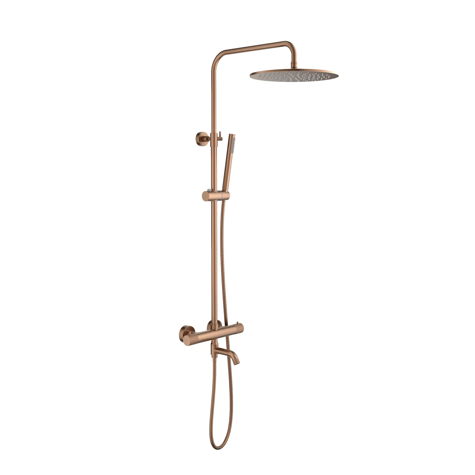 Термостатический смеситель - 1 шт., Штанга тропического душа, выдвижная - 1 шт., Держатель ручного душа (пластик) - 1 шт., Ручная лейка (латунь) - 1 шт., Тропический душ (латунь) - 1 шт., Шланг душа 1,5 м - 1 шт., Эксцентириковые соединители - 2 шт., Декоративные отражатели - 2 шт., Настенный крепеж с декоративным отражателем - 1 шт., Инструкция - 1 шт.