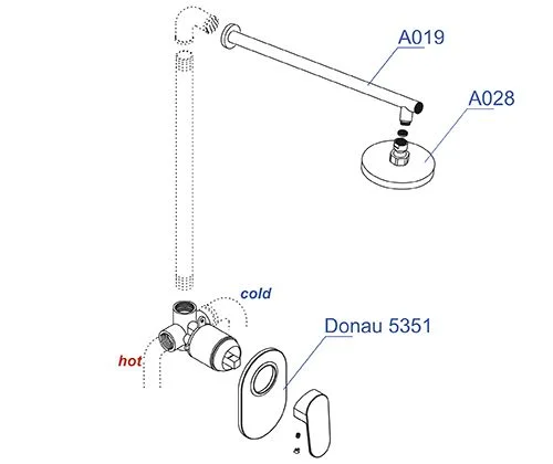 Смеситель для душа Donau 5351, Верхняя душевая насадка A028, Верхний излив для душа A019